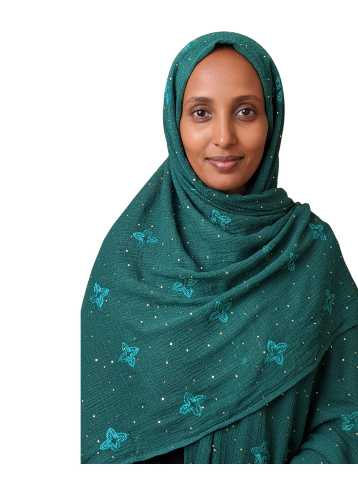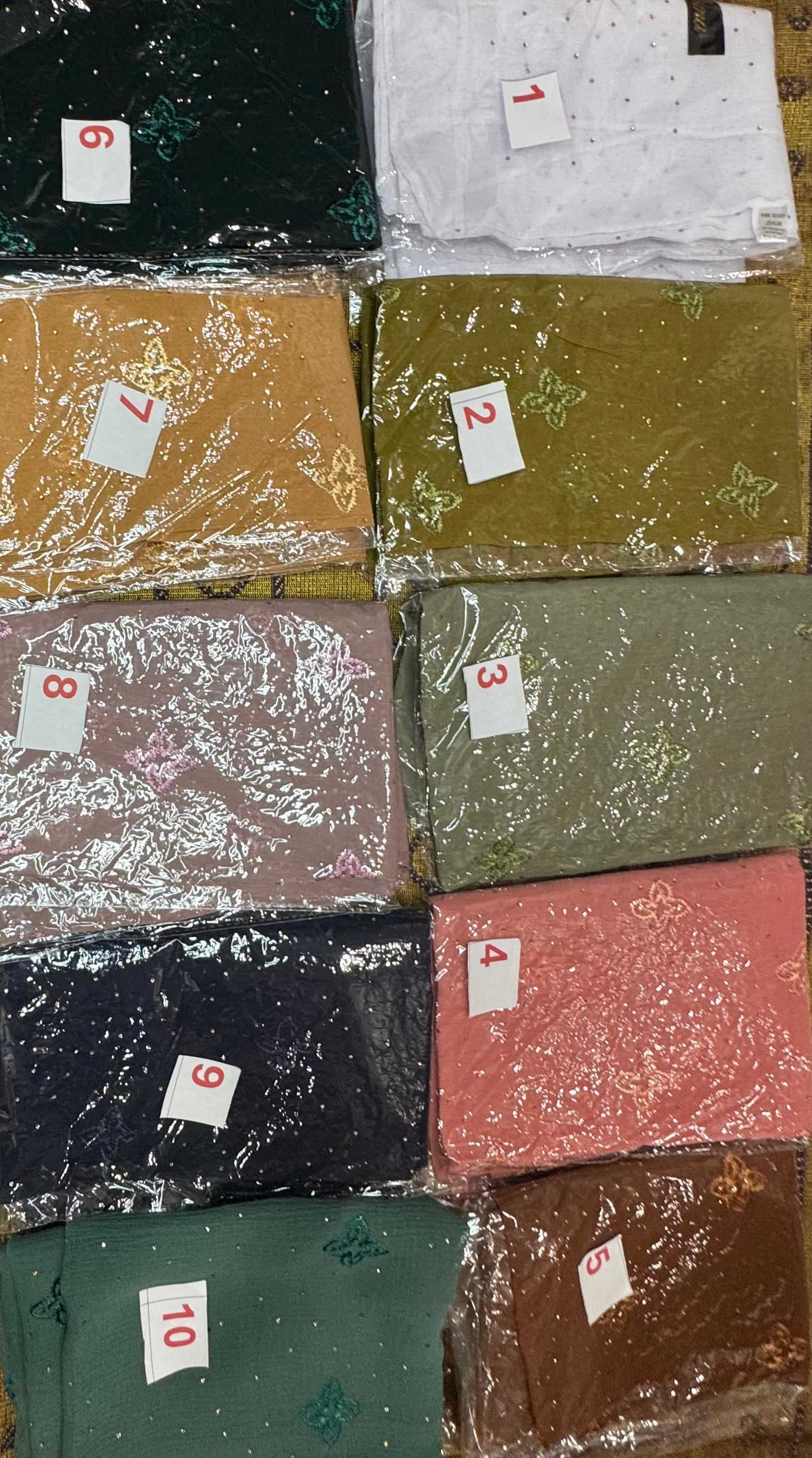 Add a whimsical touch to your modest wardrobe with this sage green textured cotton hijab, adorned with embroidered butterflies and subtle golden dots for a playful yet elegant flair.