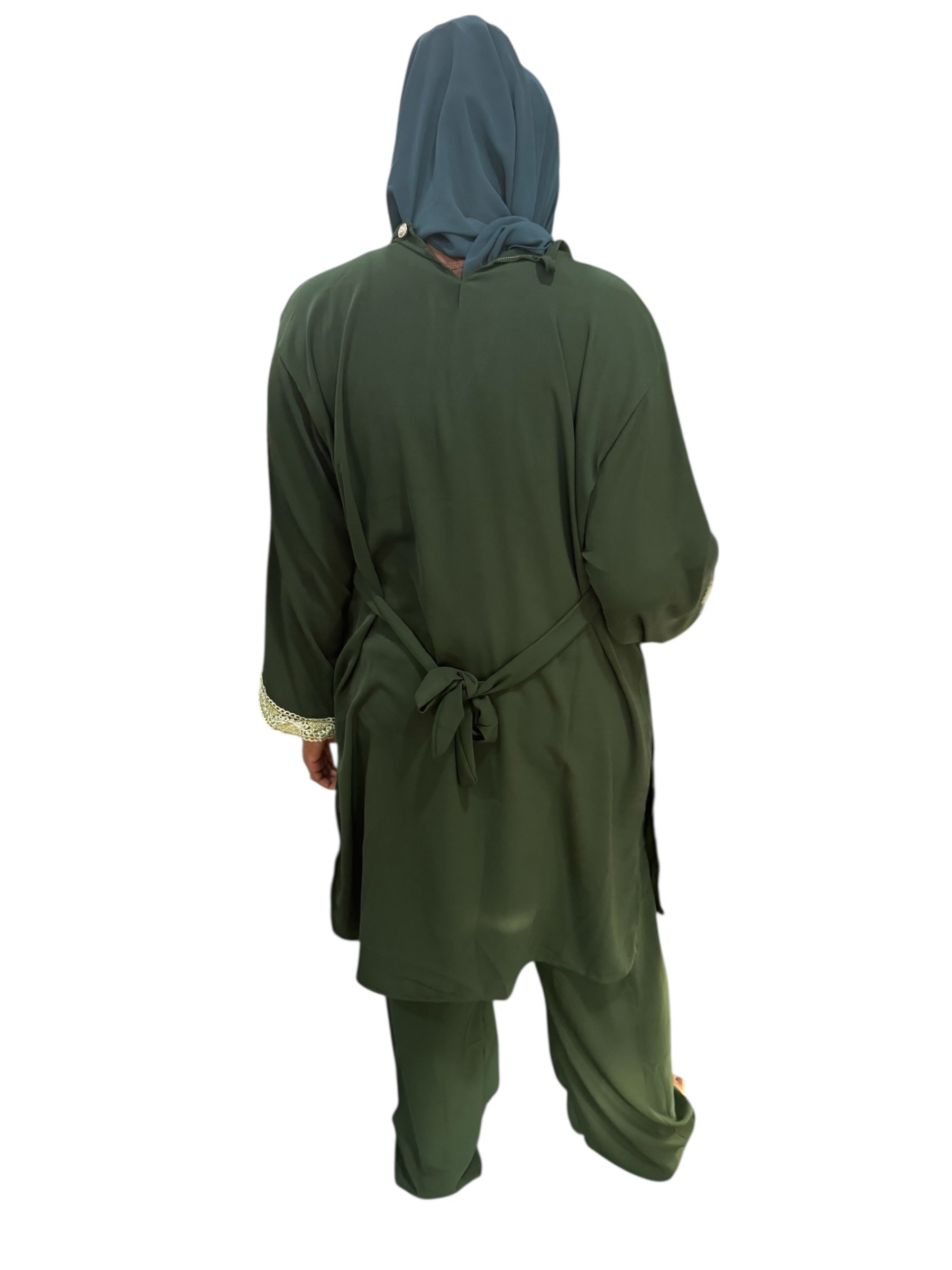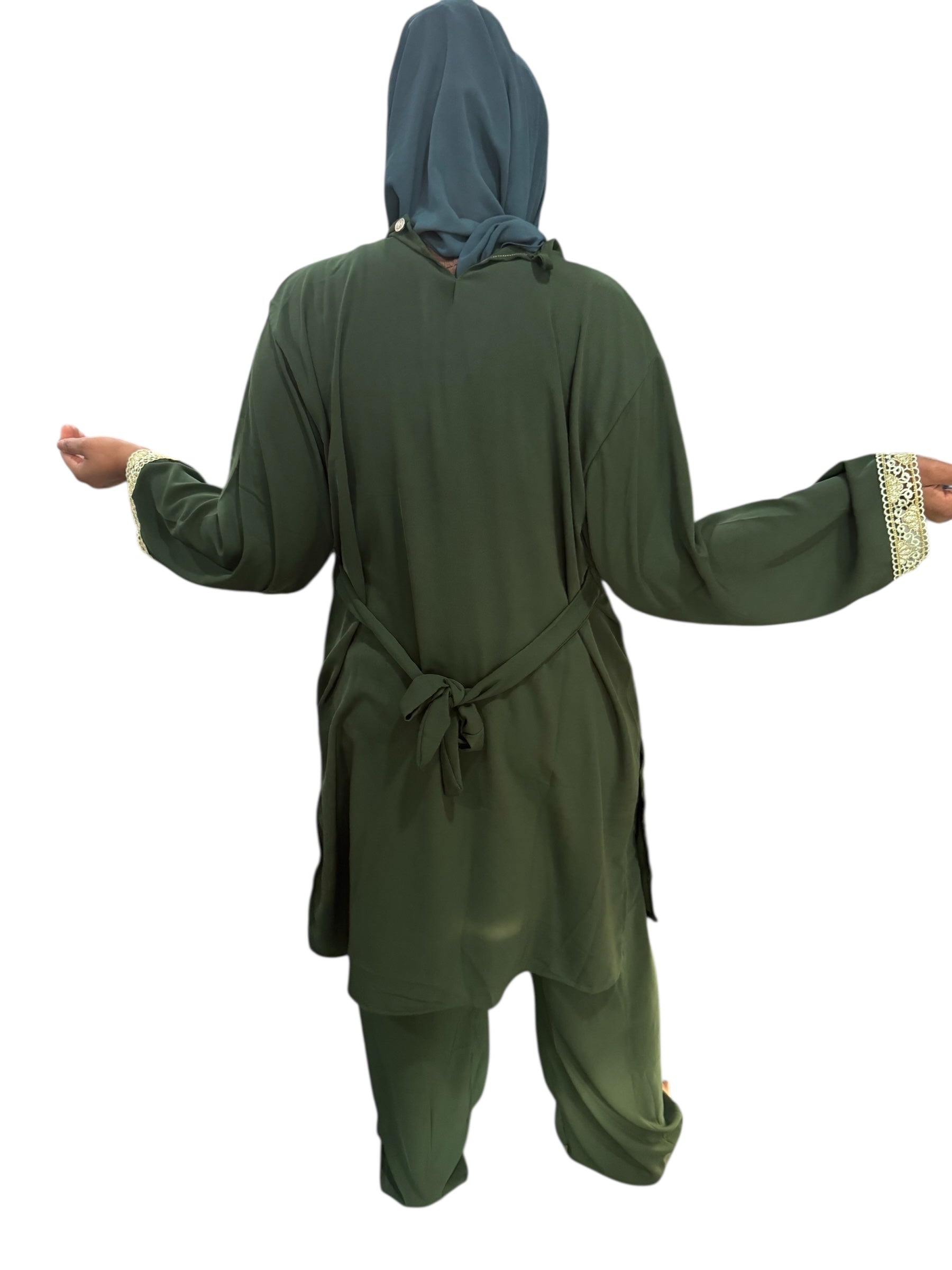 A refined two-piece tunic set crafted from soft, flowy fabric. Featuring a relaxed long tunic with waist tie detail and matching wide-leg pants for effortless elegance and comfort. Perfect for elevated everyday wear.