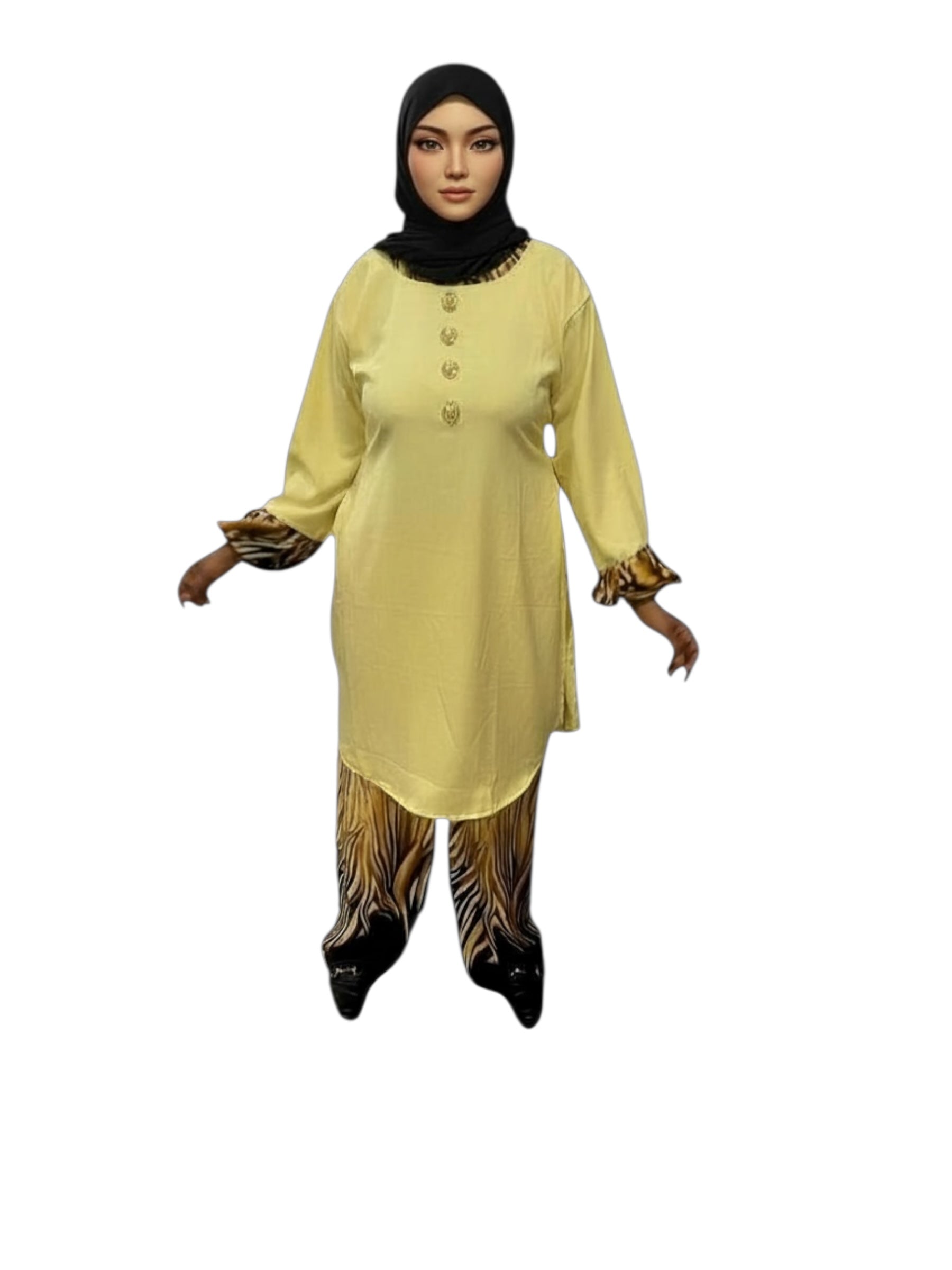 Elegant two-piece set featuring a flowing tunic with gold button detail and patterned cuff accents, paired with matching wide-leg trousers. Lightweight, modest, and effortlessly luxurious—perfect for day or evening wear.