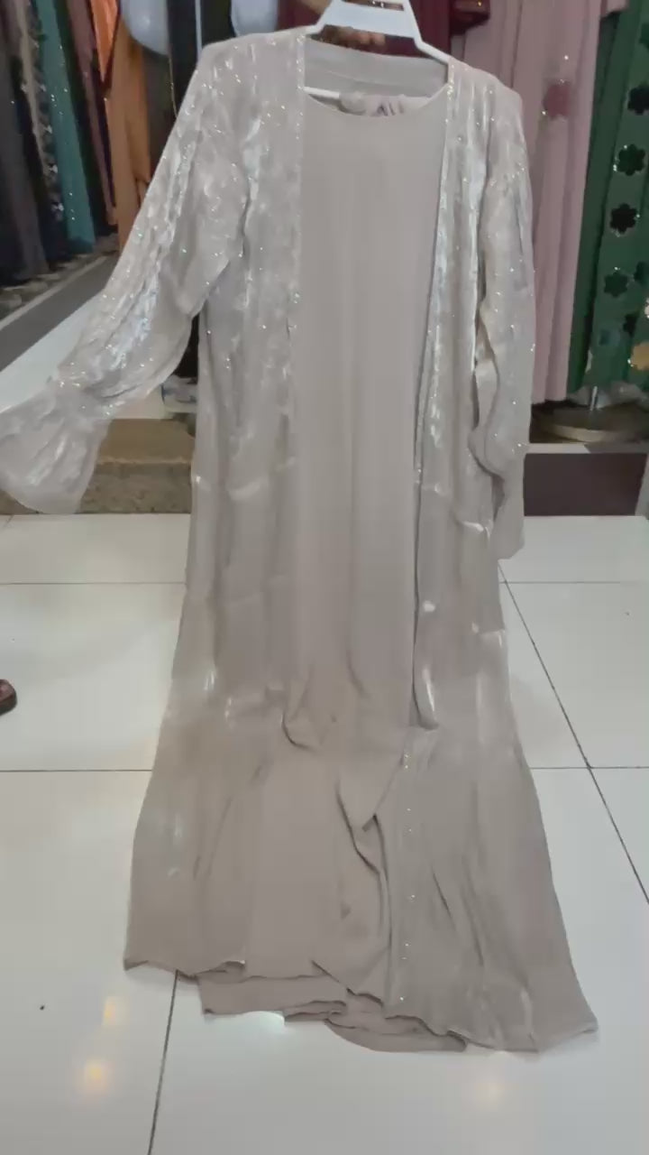 The delicate texture and fluid silhouette create a serene presence, perfect for moments that call for quiet sophistication. Whether worn for evening gatherings, special occasions, or elevated modest wear, this dress offers timeless beauty with modern ease.