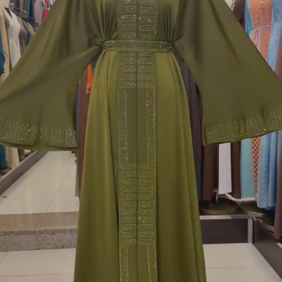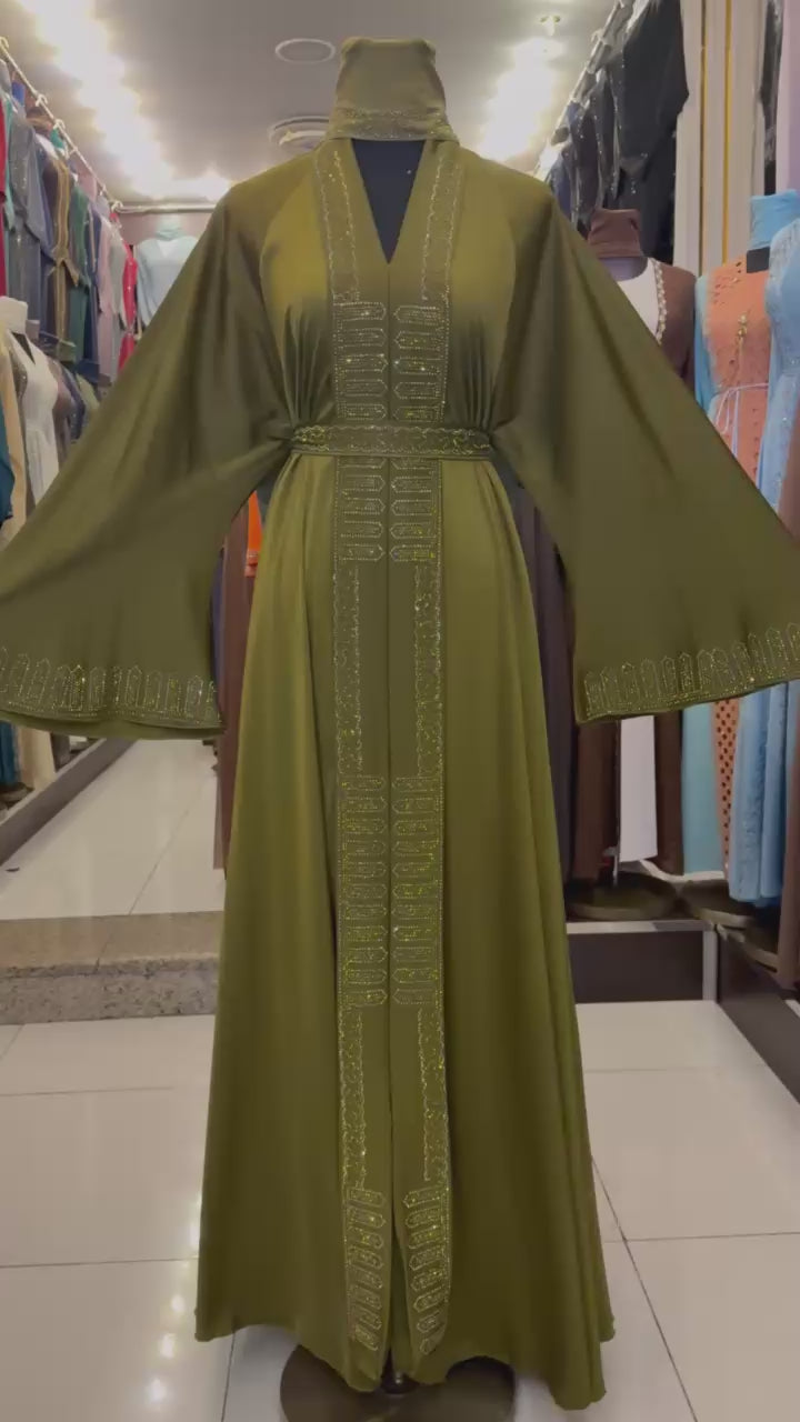 Designed with softly draped sleeves and a beautifully defined waist, it offers effortless elegance while honoring modesty. The fluid movement of the fabric enhances every step, making this piece ideal for elevated occasions and refined everyday wear.
